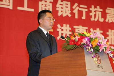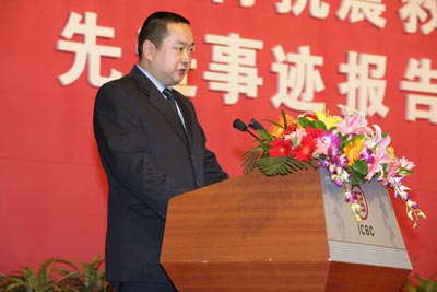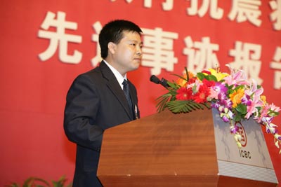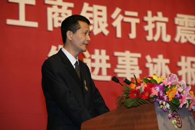 2008年7月1日,中国工商银行四川成都都江堰支行冉志祥在抗震救灾表彰暨先进事迹报告会上作先进事迹报告