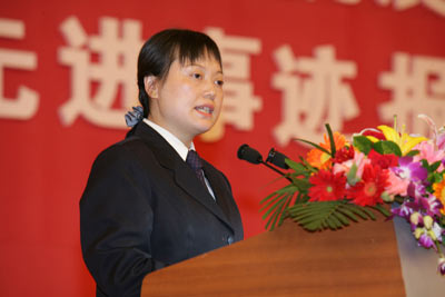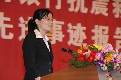 2008年7月1日,中国工商银行电子银行中心成都分中心凌媛媛在抗震救灾表彰暨先进事迹报告会上作先进事迹报告