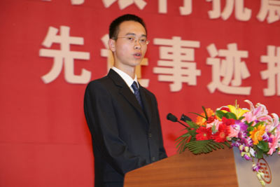 2008年7月1日,中国工商银行四川绵阳分行现金管理中心员工王炯在抗震救灾表彰暨先进事迹报告会上作先进事迹报告