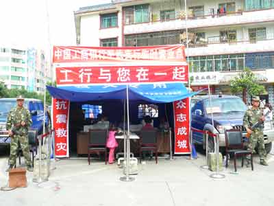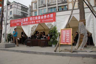 (图二)大地震发生后,工行平武支行员工在“帐篷银行”里坚持营业