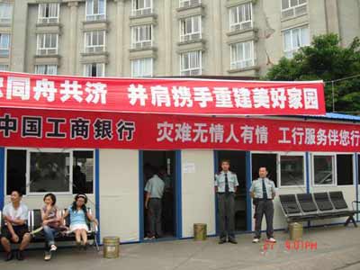 据介绍,目前,工商银行设在四川绵竹市的第一个“板房银行”已于5月27日正式对外营业,设在都江堰市的3个“板房银行”也即将投入使用。与此同时,该行四川省分行在成都、德阳、绵阳等地的10余家“板房银行”也将于本周内全面开工,并在最短的时间内正式对外营业。