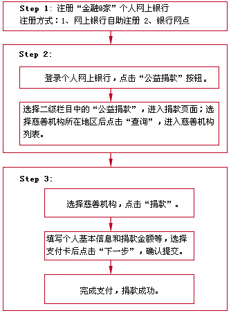 二、您可以通过以下三种方式完成向慈善机构的捐款: 1、登录中国工商银行网站直接点击“快捷功能”下的“抗震救灾网银捐款”链接进行捐款; 2、登录中国工商银行个人网上银行,直接点击“公益捐款”栏目,选择向“中国红十字会”等100余家慈善机构进行捐款; 3、登录中国红十字会等慈善机构网站使用工行网上支付进行捐款。 所捐资金即时到达慈善机构的账户中,捐款服务免收任何手续费。