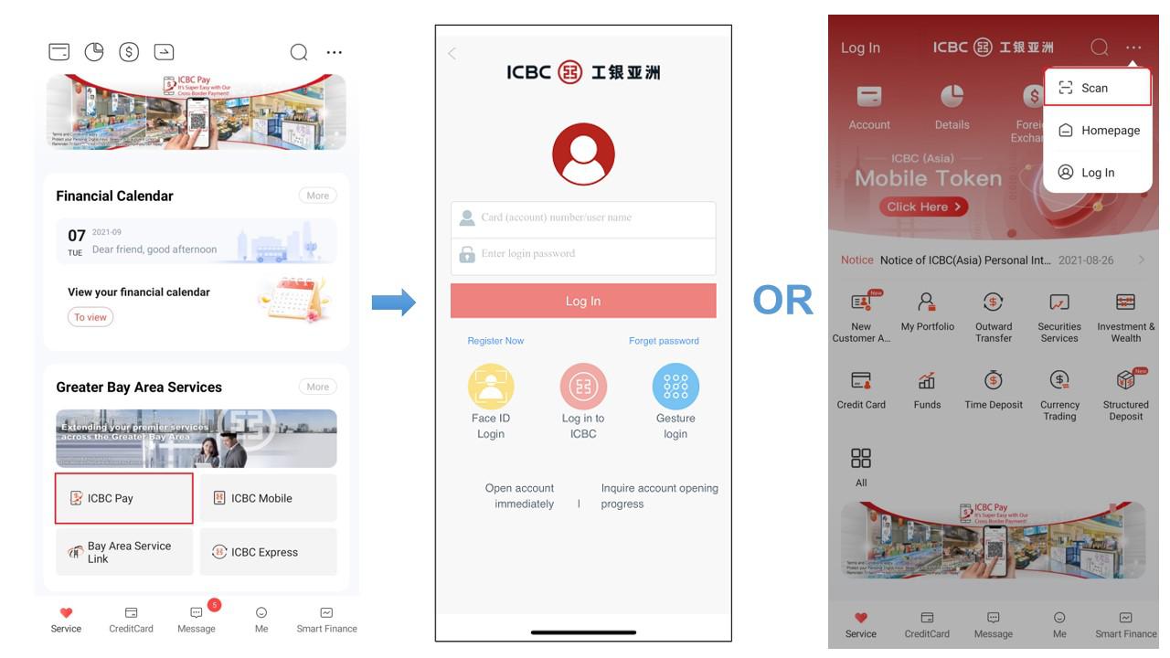 Step 1: Open ICBC (Asia) Mobile Banking App and tap ICBC Pay under “Greater Bay Area Services” column on main page