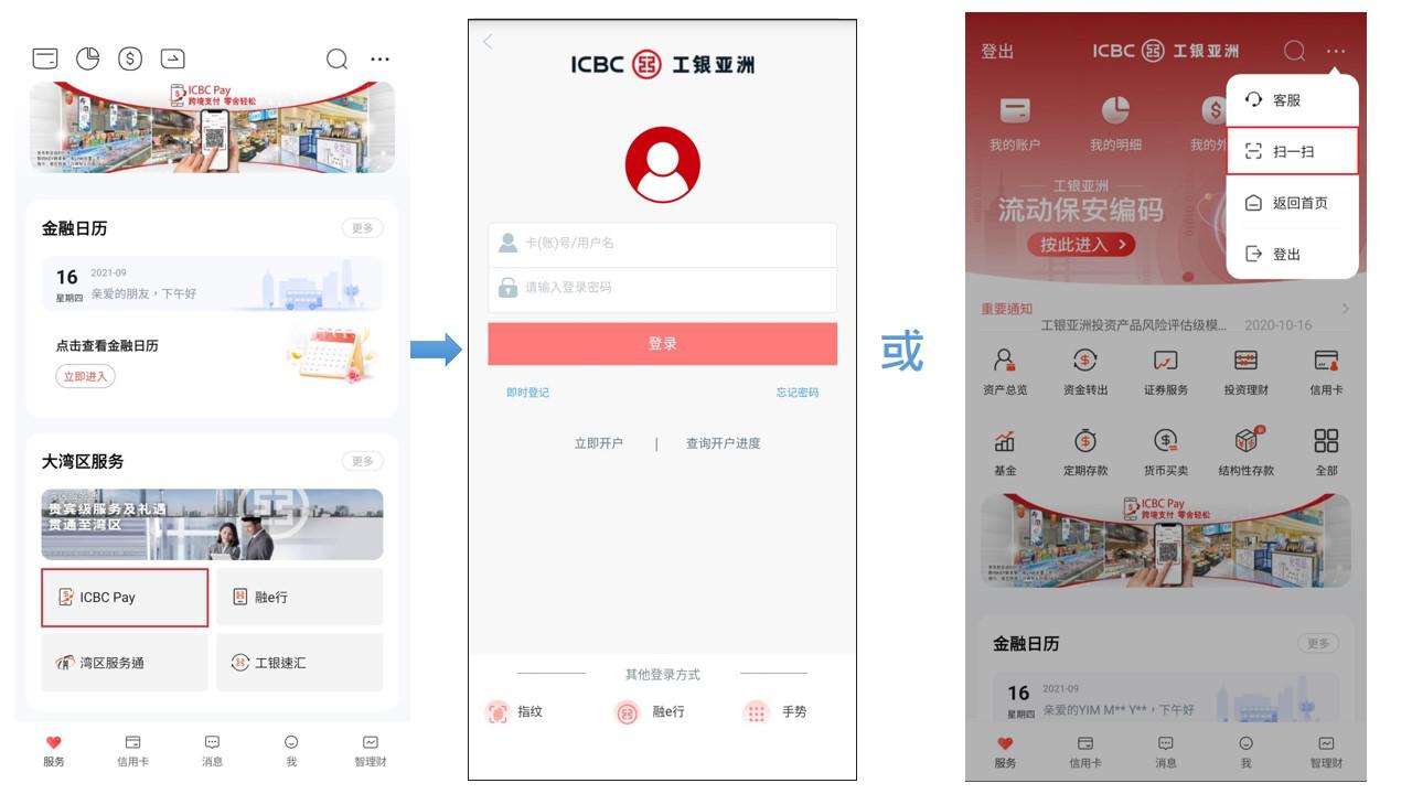 步骤1:打开工银亚洲手机银行应用程式并于首页「大湾区服务」栏目内点击ICBC Pay