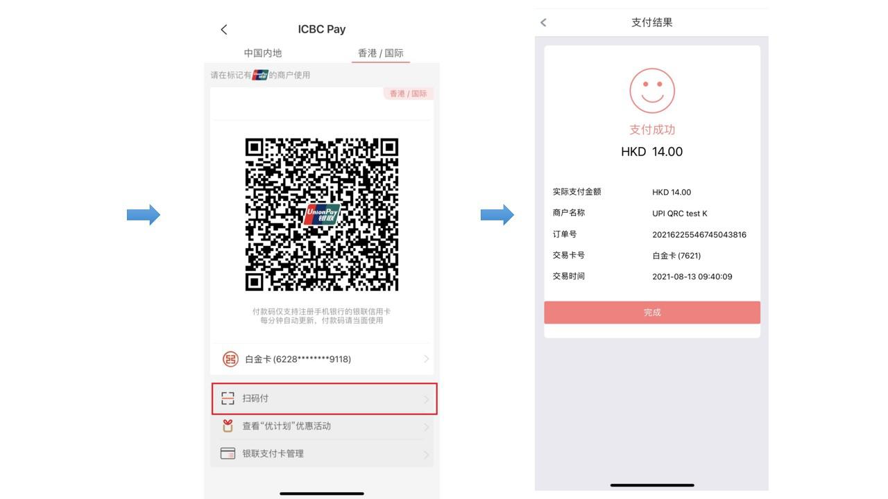 若客户在中国内地标记有银联的商户使用ICBC Pay,请选择「中国内地」付款二维码/扫码付;若客户在中国香港及海外地区(非中国内地)标记有银联的商户使用ICBC Pay,请选择「香港/国际」付款二维码/扫码付。