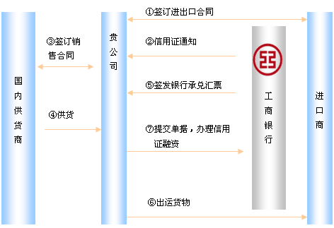(二)适用对象:具有进出口业务经营权的法人客户和小企业。 (三)特色优势 1.通过对国内、国际融资产品的有机组合,为贵公司的内外贸易提供全流程配套服务; 2.密切贵公司与国内购货商的商业关系,扩大业务合作空间。 (四)开办条件 您收到出口信用证后,因流动资金周转紧张,不能向国内供货商支付货款,进而无法按照出口信用证的要求备货出运时。 (五)服务渠道与时间:在我行国际结算及结售汇业务经营网点的营业时间内办理。 (六)常见问题 1.贵公司需在工商银行评定信用等级,并核有授信额度; 2.贵公司与进口商有长期的业务合作关系,进口商信誉良好,没有无故拖延付款情况; 3.国内供货商产品质量上乘,有品牌优势。 (七)业务示例 A公司为贸易进出口公司,与国外进口商B公司签订进出口合同,A、B公司约定以国际信用证为贸易结算方式。A公司因人民币资金紧张,无法落实与国内供货商C公司签订国内购销合同事宜,进而对出口来证能否如期执行心存疑虑。 为满足A公司的业务需求,工商银行向其推荐办理“贸财通”产品套餐。A公司将B公司委托银行开出的信用证正本提交工商银行,工商银行为A公司开立银行承兑汇票,使其得以向C公司采购原材料进行加工生产。向B公司出运货物后,A公司将信用证项下全套单据提交工商银行对外索汇,收到开证行付款后归还银行承兑汇票。 如果A公司需要,我行还可为其办理出口信用证押汇/贴现/福费廷等融资业务及资金理财服务,但融资款必须用于归还银行承兑汇票。 本页面内容仅供参考,部分内容以当地分行公告与具体规定为准。