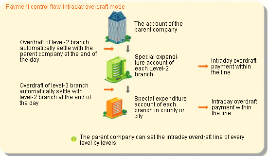 3. Short-term Financing Solution All accounts of the branches of the enterprise are "zero balance accounts". To meet the demand of the daily expense, ICBC can set the expenditure accounts of the branches as "intraday overdraft accounts"; the parent company sets the intraday overdraft limits of the branches level by level and every branch can conduct daily payments within the line. At the end of the operation hours of every day, ICBC system will automatically liquidate the balances of the branches with the higher-level companies so as to eliminate the balance of the intraday overdraft accounts.