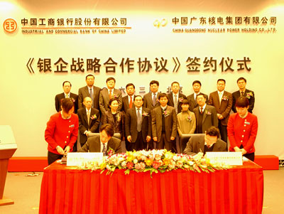 3月28日下午,中国工商银行与中国广东核电集团有限公司在京签署了《银企战略合作协议》。根据协议,中国工商银行将通过银团贷款等方式,在“十一五”期间向广东核电集团核电项目建设和生产运营提供人民币600亿元的信贷支持,广东核电集团也将选择中国工商银行作为最重要的合作伙伴,在金融市场开展广泛深入的合作。中国工商银行行长杨凯生、副行长李晓鹏,中国广东核电集团有限公司总经理贺禹、总会计师岳林康等出席了双方签字仪式。