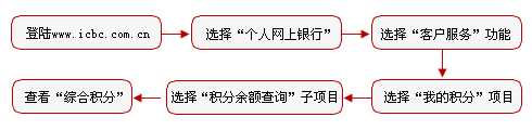 七、操作指南: 1、积分查询 通过“查询缴费机、转帐汇款机”查询 客户可以到工商银行宁夏分行的任一营业网点,通过网点内布设的“查询缴费机、转帐汇款机”等自助终端进行查询相关综合积分信息。客户将我行银行卡插入查询缴费机或转帐汇款机等自助终端后,按操作提示进行查询。 通过“网上银行”查询
